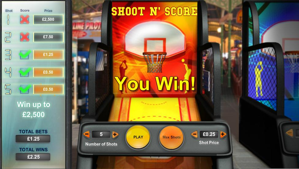 Et spil som hedder Shoot n Score, handler om basketbold. Du kan være helt roligt, hvis du ikke ved meget eller noget om basketbold. Dette spil er nemt at spille og alle kan spille det. Før du starter spillet, skal du satse din indsats, lige som hvis du spillede spilleautomater. Så skal der vælges, hvor mange bolde du vil spille med. Du kan vælge op til 5, og det tilrådes at spille med alle bolde. Så er dine chancer størrer for at vinde mere. Nu skal vi kaste bolde. Klik skyd og spillet vil kaste dine bolde for dig. På en resultatstavle kan du se, hvor meget hver bold er værd.