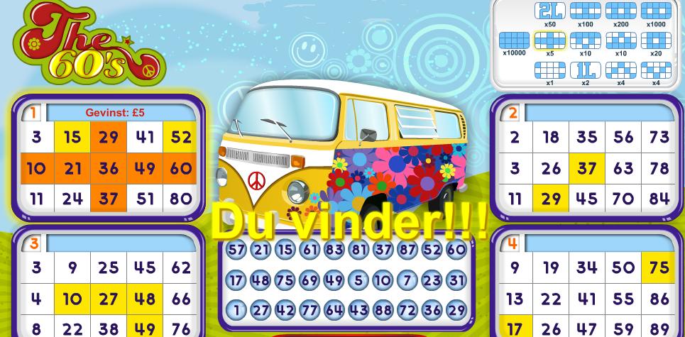 Tag med Megascratch tilbage til 60erne og spil et sjovt og faverigt spil!! Blandt de mange mulige spil som slotmaskiner og spilleautomater, vil du finde The 60s. Et meget anderledes online bingo spil, hvor du ikke skal vente på andre spillere eller skal have en hel plade fuld for at vinde.
